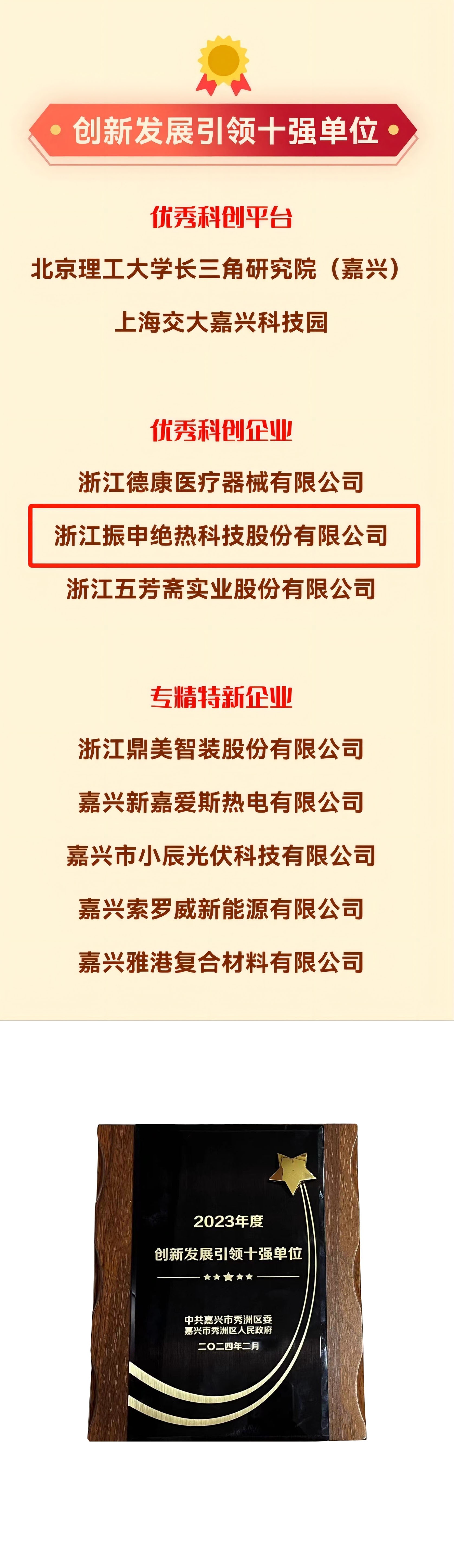 振申絕熱憑借其在絕熱保冷材料研發(fā)、生產(chǎn)和銷售領(lǐng)域的創(chuàng)新實(shí)力,成功躋身“2023年度創(chuàng)新發(fā)展引領(lǐng)十強(qiáng)單位優(yōu)秀科創(chuàng)企業(yè)”榜單。